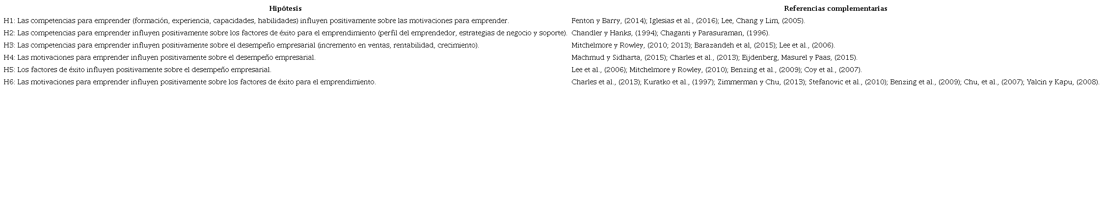 Con base en este soporte teórico, se conceptualiza el modelo que sustenta la presente investigación y se plantean las hipótesis respectivas. Ver Tabla 4.