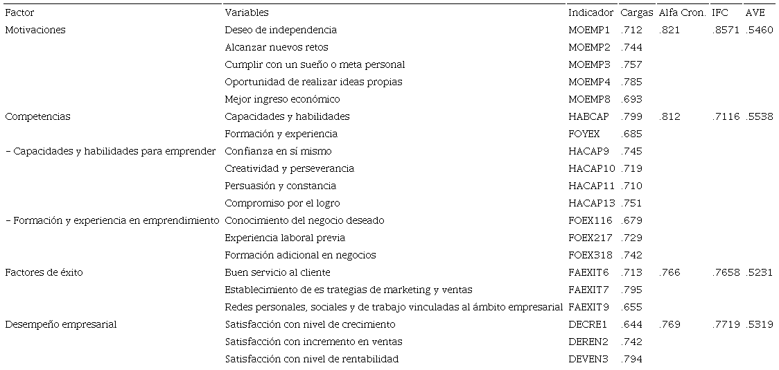 Para explorar los factores que contribuyen al emprendimiento y éxito empresarial, se revisaron investigaciones previas. Se definieron cómo constructos de estudio, las motivaciones, las competencias, los factores de éxito y el desempeño empresarial. Otros modelos, por ejemplo GEM (Global Entrepreneurship Monitor) incluyen en su análisis las intenciones o aspiraciones para emprender. No se introdujeron en el modelo propuesto, porque son un referente del potencial y la calidad del emprendimiento, lo cual favorece más la identificación de los tipos de emprendedores y está fuera del alcance de esta investigación. La selección de los ítems se hizo, tomando en cuenta las dimensiones y variables usadas para representar cada constructo, la confiabilidad y validez de los indicadores, y la calidad de los resultados obtenidos. A partir de allí, se diseñó la escala de medición y se llevó a cabo el proceso de validación aparente y de contenido con expertos en el área y una prueba piloto a 30 emprendedores. Se hicieron algunos ajustes de redacción y se procedió a su aplicación con la ayuda de los encuestadores.