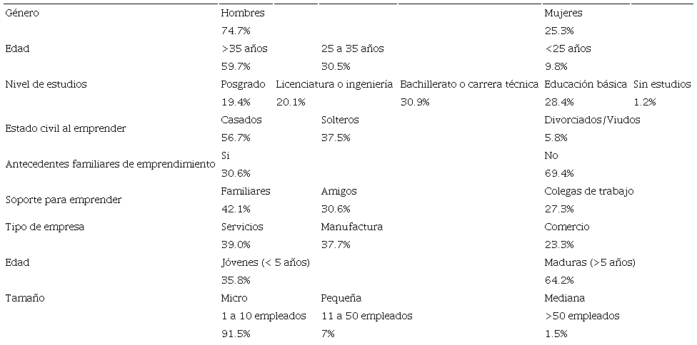 La Tabla 7, resume la información relacionada con la muestra. En ella se observan, porcentajes más grandes de hombres participando en emprendimientos; igualmente que son las personas mayores de 35 años las que optan por su independencia y crean su propio negocio. El porcentaje más significativo de emprendedores sólo tiene estudios de bachillerato, carrera técnica o educación básica (primaria y secundaria). Únicamente, el 39.5% cuenta con estudios universitarios y de posgrado. El emprendimiento se presenta mayormente en personas casadas, sin antecedentes familiares en el desarrollo de actividades de este tipo (69.4%). Y el mayor estímulo para emprender proviene de sus familiares (42.1%). En cuanto a la unidad muestral, está integrada por micronegocios (91.5%), pequeñas (7%) y medianas empresas (1.5%) de los sectores de servicios, comercio y manufactura. Siendo los hombres lo que emprenden mayormente en el sector de manufactura, mientras las mujeres lo hacen en el de servicios y comercio. La mayoría de las empresas de los emprendedores han estado funcionando en el mercado por más de 5 años.