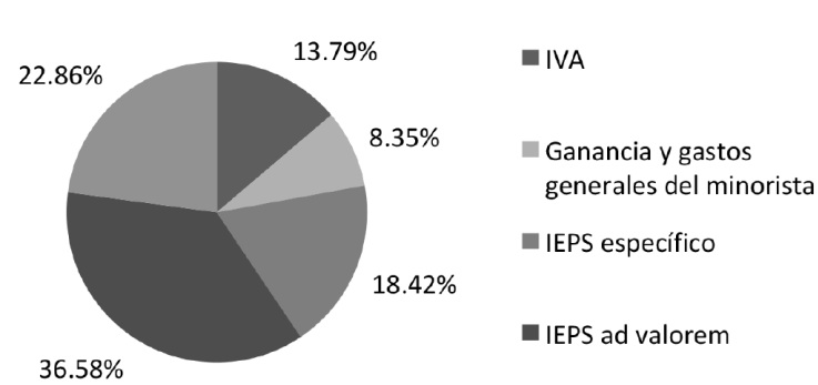 Actualmente, la tasa de IEPS a los cigarrillos es de 160% sobre el precio de venta al detallista y el IEPS específico es de $0.35 pesos por cigarro. La tasa de IVA es de 16% sobre el precio de venta al consumidor. La última vez que se modificaron los impuestos a los cigarros fue en 2011. Tal como se muestra en la Figura 1, el precio de venta al público de una cajetilla de cigarros se integraba de la siguiente manera: el precio del mayorista, que incluye el precio de fábrica, la ganancia y gastos generales del mayorista, representa un 22.86%; el IEPS ad-valorem un 36.58% y el componente especifico de este impuesto un 18.42%; un 8.35% corresponde a las ganancias y gastos generales del minorista; y el IVA representa un 13.79%.