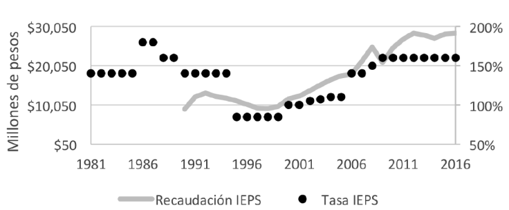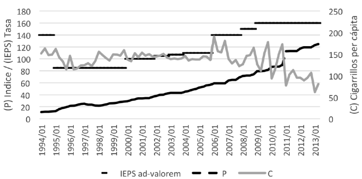 Entre las explicaciones que se han brindado para entender las variaciones en la tasa del IEPS a tabacos labrados, Sáenz de Miera e Iglesias (2010) y Sáenz de Miera (2013) atribuyen el aumento de esa tasa a 180%, en 1986, a la necesidad de mejorar la recaudación fiscal, en ese año de crisis económica severa. Por otro lado, Meneses González et al. (2002) sugieren que, aunado a otras acciones, la baja de la tasa del IEPS observada en la década de los 90’s reduciría el contrabando de tabaco. Al revisar la evolución del impuesto al tabaco, Sáenz de Miera (2013: p. 144) anota que “este impuesto ha sufrido varios cambios desde su creación en 1981, pero sólo hasta hace alrededor de diez años comenzaron a vincularse claramente con fines de salud pública.” Esto último, es coincidente con la firma y ratificación del CMCT por parte de México.