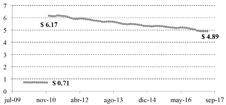 En 2010, se propuso un aumento gradual del impuesto específico de $0.04 a $0.40 por cigarro, así como otros ajustes al IEPS ad-valorem. Los aumentos al IEPS ad-valorem no fueron aprobados, ya que la Comisión de Hacienda de la Cámara de Diputados consideró que fomentarían la sustitución a productos de tabaco de menor precio, haciendo su efecto poco efectivo. La reforma aprobada consistió en el aumento de la cuota fija, de $0.04 a $0.35 pesos por cigarro, a partir de 2011. La Figura 3 muestra la evolución real del componente específico en pesos por cajetilla de 20 cigarrillos.