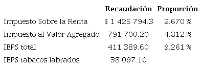 La Tabla 1, compara la recaudación por concepto de IEPS de tabacos labrados con la de otros impuestos federales. En el año 2016, el ingreso tributario por concepto de IEPS a tabacos labrados fue de $38 mil millones de pesos (mmp). Esta cantidad representó un 9.2% de la recaudación total de IEPS, un 4.8 de la recaudación del IVA y un 2.7% de la recaudación del impuesto sobre la renta (ISR).