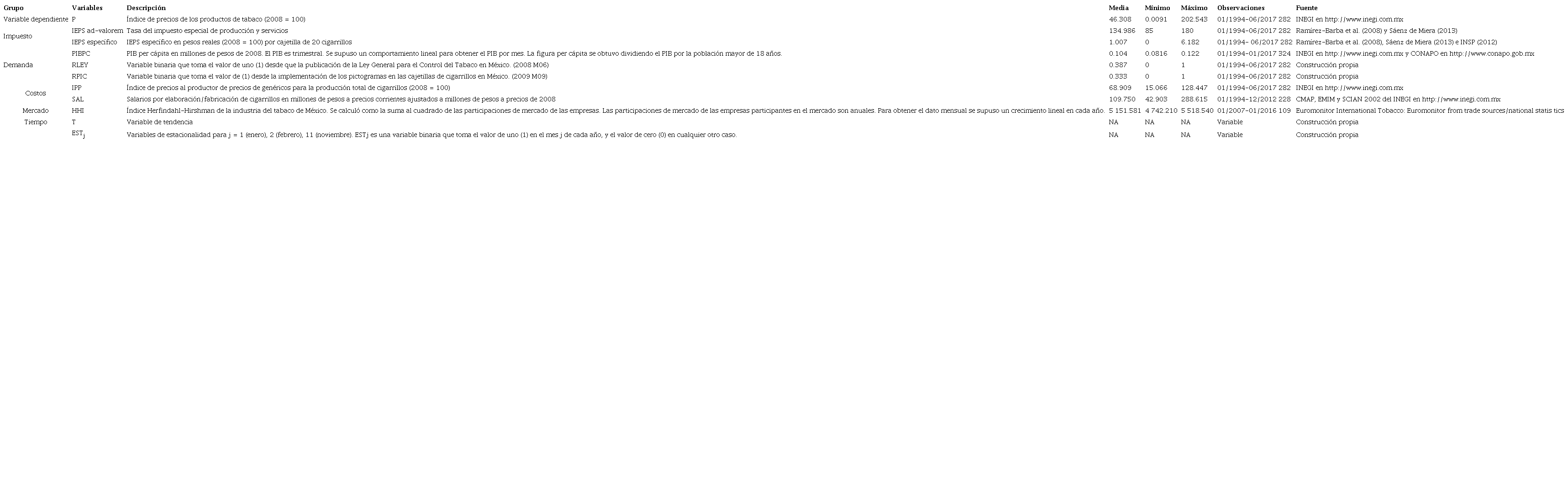 Para cumplir con dicho objetivo, especificamos un modelo en forma reducida y lo estimamos usando 282 observaciones mensuales (enero, 1994 a junio, 2017). En las ecuaciones, que relacionan el precio de los productos de tabaco y los impuestos, se incluyeron como variables de control los determinantes de la demanda de tabaco, los costos de producción de productos de tabaco, la estructura de mercado de la industria de tabaco, así como la tendencia y estacionalidad de los precios de tabaco.