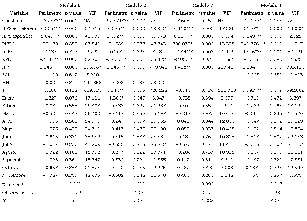 Para tratar de corregir este problema, eliminamos la variable de tendencia (T) en la estimación de los modelos. Aunque el problema se reduce, aún persiste. El índice de precios al productor (IPP) y el índice de Herfindahl - Hirshman (HHI) parecen ser las variables que causan el problema. Otra alternativa que aplicamos para aminorar la multicolinealidad, fue estimar los modelos convirtiendo las variables en logaritmos naturales, aunque tampoco ayudó a aminorar el problema de multicolinealidad. De nuevo, las variables logarítmicas de IPP y HHI, entre otras, siguieron causando este problema.
