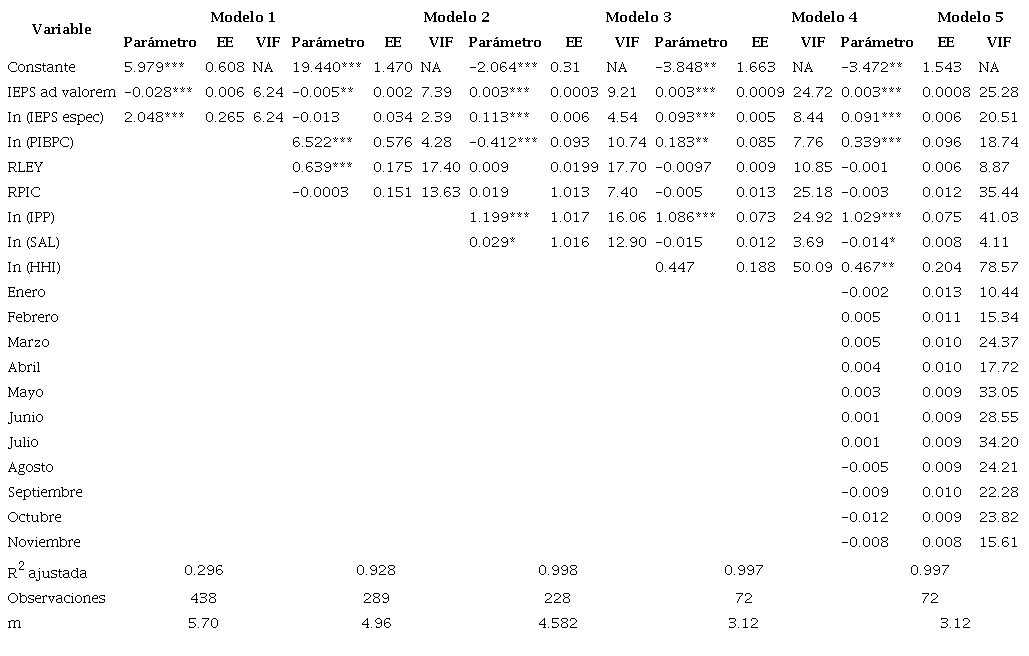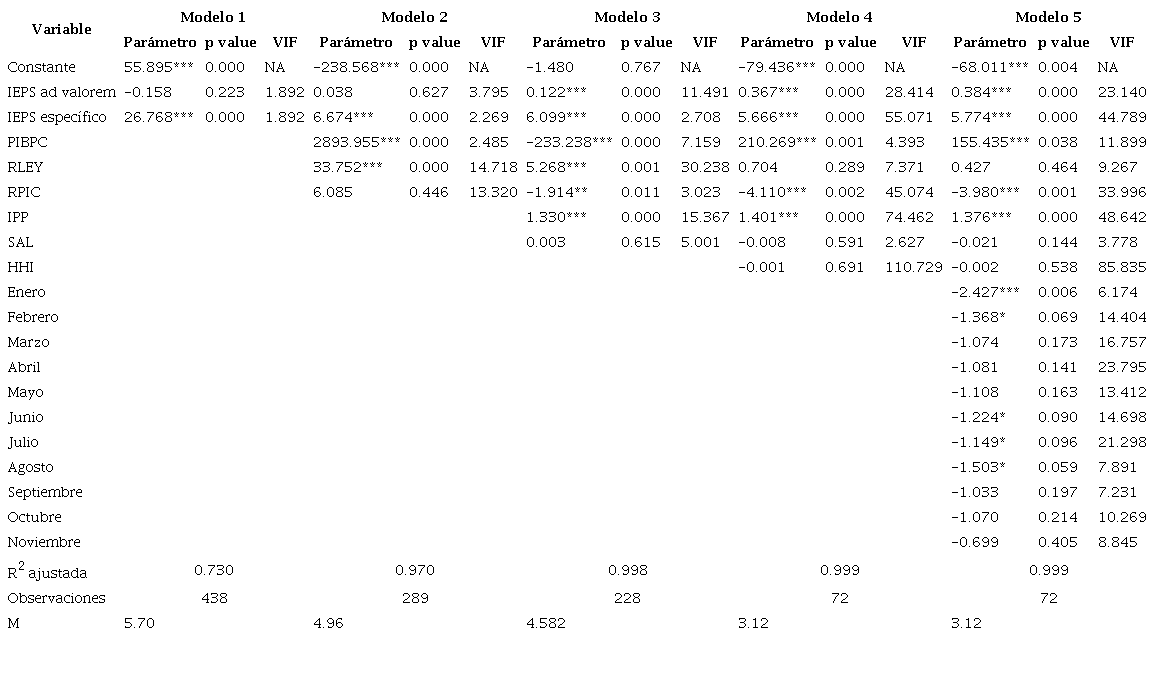 Las Tablas 3 a 5 contienen los resultados de las estimaciones. En la Tabla 3 aparecen los modelos estimados variando el número de observaciones, al alternar las variables SAL y HHI. Como se puede apreciar, los resultados muestran evidencia de multicolinealidad severa en todos los modelos estimados. En particular, las variables T e IPP observan VIF’s que varían de 253 a 726, para la primera variable, y entre 233 y 780, para la segunda. La presencia de multicolinealidad puede provocar cambios bruscos en los valores y signos de los parámetros estimados, tal como se puede apreciar, por ejemplo, entre los modelos 2 y 3 en la Tabla 3. Igualmente, la multicolinealidad puede movernos a no rechazar hipótesis de significancia estadística, que al corregir el problema deban ser rechazadas. Ambas situaciones, nos llevarían a conclusiones erróneas con relación al efecto del impuesto sobre el precio de los productos del tabaco.