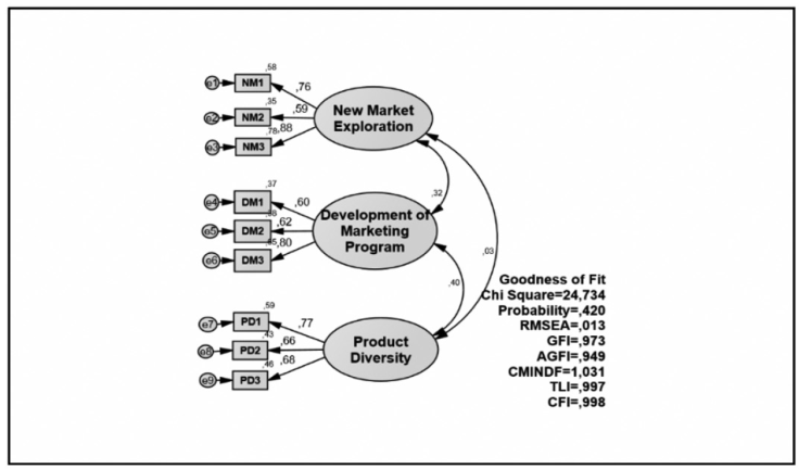 Exploration of new markets significantly affects knowledge exploitability. This means information resulting from new market exploration can lead to knowledge exploitability. This is possible because Batik SMEs in Indonesia usually meet product uniqueness following the characteristics of each customer so that they meet the product uniqueness and customer value can improve the quality of information. The result of this study supports the previous research conducted by J. Wang (2016), which states that market exploration represents the ability of the organization to learn through questions, push the limits of knowledge, and engage proactively in risk-taking.