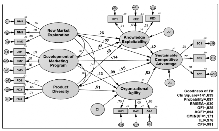 Este artículo tiene como objetivo investigar el efecto mediador de la explotación del conocimiento (KE) y la agilidad organizacional (OA) en la relación entre la exploración de nuevos mercados (NME), el desarrollo de programas de marketing (DMP) y la diversidad de productos (PD) con una ventaja competitiva sostenible. (SCA). Se recopilaron datos de 189 PYME de Batik en Indonesia y se analizaron mediante el modelo de ecuaciones estructurales (SEM). El resultado muestra que la exploración de nuevos mercados y el desarrollo de programas de marketing afectan significativamente la explotación del conocimiento, la diversidad de productos afecta significativamente la agilidad organizacional, la explotación del conocimiento y la agilidad organizacional afectan significativamente la ventaja competitiva sostenible. Además, se ha demostrado que la explotación del conocimiento y la agilidad organizativa median la correlación entre la exploración de nuevos mercados, el desarrollo de programas de marketing y la diversidad de productos con una ventaja competitiva sostenible.