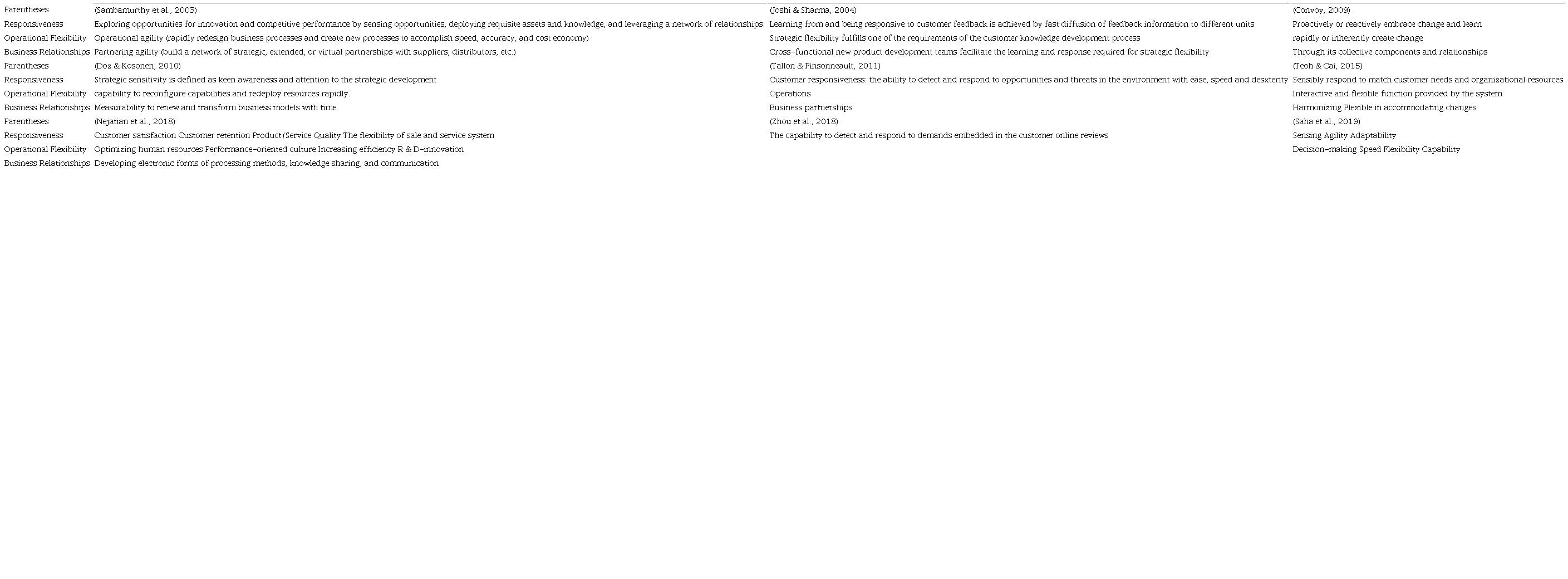 To build an intuition of common themes and identify gaps in the literature, we followed the procedures outlined by Shepherd & Sutcliffe (2011) to trace the meaning and conceptualization of agility. Specifically, we first conducted a broad search in the management literature (including information systems and marketing) to identify articles using agility or related terms. Our search covered scholarly and practitioner journals and yielded studies in the strategy, information systems, and marketing literature. From the literature review above, we found that agility consists of 3 main dimensions, namely, Responsiveness, Operational Flexibility, and Business Relationship. Summary of research results from 2003 - 2019 in Table 1 shows the development of the 3 main dimensions of agility.
