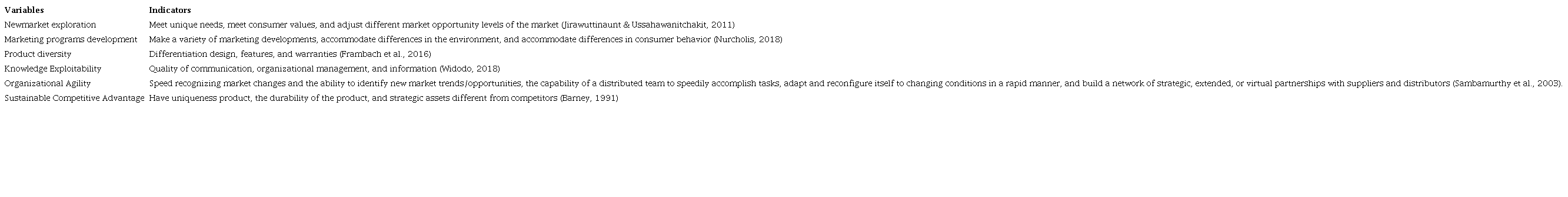 The concept of marketing program development is the creation of core variations and expansion of marketing programs in the accommodation of environmental differences, consumer behavior, use of patterns, and conditions of a competition (Moscardo & Murphy, 2016). The marketing program developed is an adaptation of the marketing mix, for example, products, promotions, prices, and distribution (Lages et al., 2008). Sharing marketing programs with other business units to increase profit margins to achieve greater efficiency (Bahri-Ammari & Bilgihan, 2017). Marketing program development as the degree of variation of marketing development and expand marketing programs to accommodate differences in environmental and consumer behavior to accommodate the exploit opportunities and capacity to identify more quickly than rivals (Nurcholis, 2018). These programs can affect knowledge (Nejatian et al., 2018), current skills and abilities (Subramony et al., 2018), responsiveness, operational flexibility, and business relationships (Baškarada & Koronios (2018), Worren et al. (2014), Teoh & Cai (2015), Doz & Kosonen (2010), Sambamurthy et al. (2003), Joshi & Sharma (2004), Conboy (2009). Therefore, the development of a marketing program can increase knowledge exploitability, organizational agility, and sustainable competitive advantage.
