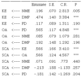 Table 8 shows that NME and DMP significantly affect KE, PD significantly affects OA. Furthermore, KE and OA significantly affect SCA.