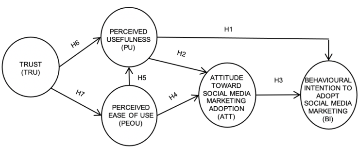 Similar to how Gefen et al. (2003) demonstrated in his study that Trust had a positive impact on the Perceived Usefulness of a website, the objective of this study was to determine whether or not Trust affects either the Perceived Usefulness or the Perceived Ease of Use of social media marketing. To this end, the following hypotheses were made: