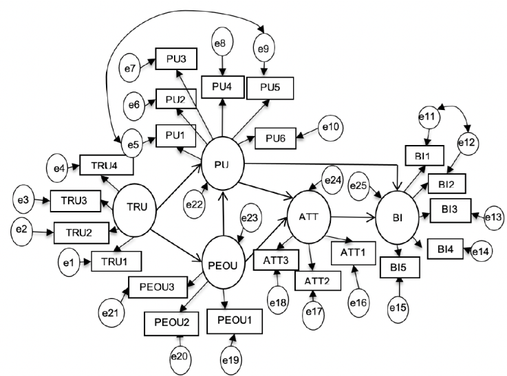 According to TAM, the intention to voluntarily accept and use a new information technology (IT) is determined by two beliefs: (a) Perceived Usefulness (PU) of using the new IT and (b) Perceived Ease of Use (PEOU) of the new IT. PU is a measurement of an individual’s subjective evaluation of the usefulness of the new IT in a context related to the specific task, while PEOU is an indicator of the cognitive effort required to learn and use the new IT (Teo et al., 2015).