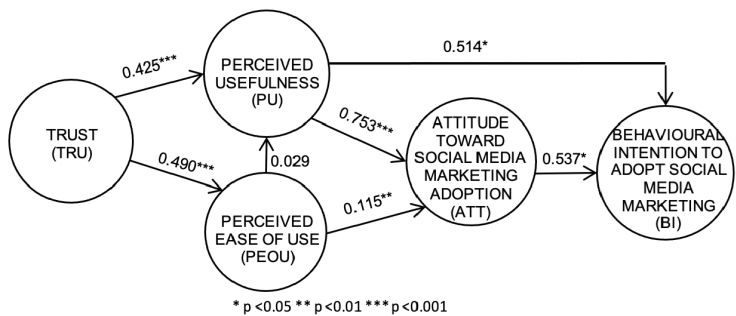 The values for the coefficients and the p-values for each of the regression equations considered in the structural model are presented in Figure 3. Of the seven hypotheses, only one of them is not supported by the data (H5), meaning that it is not possible to affirm that Perceived Ease of Use of social media marketing has a positive effect on its Perceived Usefulness. On the other hand, the Behavioural intention to adopt social media marketing is promoted by both Perceived Usefulness and by Attitude toward its adoption, according to the support found for hypotheses H1 and H3, respectively. In addition, trust directly and positively affects factors like Perceived Usefulness and Perceived Ease of Use (hypotheses 6 and 7). Lastly, Attitude toward social media marketing adoption is influenced by factors like Perceived Usefulness and Perceived Ease of Use (hypotheses 2 and 4).