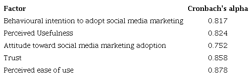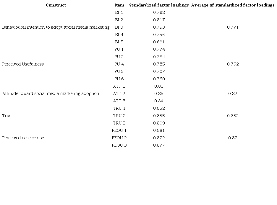 Behavioural intention was measured through the question: “What does your company use social media for? With five answer options (5 items): To make sales / To attract and retain customers / To promote products / To resolve doubts and complaints of customers / database (adapted from Reuter, Ludwig, Kaufhold, & Spielhofer, 2016). To measure Perceived Usefulness 6 items were used. An example of item is “Using social media is useful for companies” (adapted from Venkatesh, 2000). To measure attitude towards social media marketing adoption 3 items were used. One of the items is “Social media are a useful tool for sharing information between companies and their current and potential consumers” (adapted from Reuter, Ludwig, Kaufhold, & Spielhofer, 2016). Regarding the construct Trust, 4 items were considered. “It is safe providing sensitive information in social media” is an example of item (adapted from Taylor, Lewin, & Strutton, 2011). Perceived ease of use was measured through 3 items. An example of item is “Learning to use social media is easy” (adapted from Lane & Coleman, 2012).