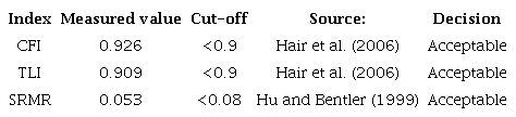 Other indices of fit used in this study to verify the goodness of fit of the model are the CFI, TLI and SRMR indices. According to Hair et al. (2014), the values of the CFI and TLI indices vary from 0 to 1 and values above 0.9 indicate a good fit. As for the SRMR index, Hu and Bentler (1999) establish that the cut-off point is 0.08, meaning that values below these points are necessary in order to conclude that there is a good fit.