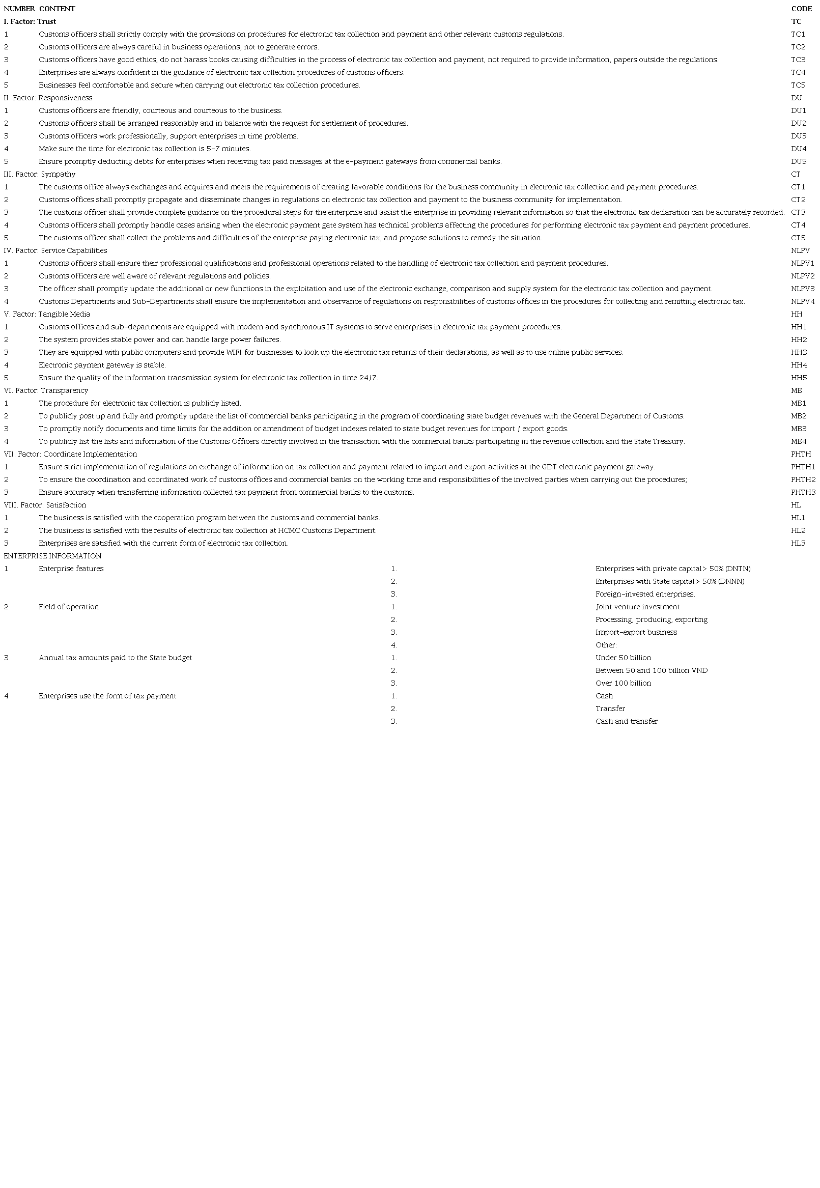 Examining the actual research results of the previous topics, the author proposes factors that affect the satisfaction of importers and exporters of electronic tax collection procedures at the Customs Department of Ho Chi Minh City. These include: (1) Trust; (2) Responsiveness; (3) Sympathy; (4) Service Capabilities; (5) Tangible Media. In addition, the results of previous studies show that the field of fiscal administration, taxation is a public administrative service operating under the mandate of the State administrative apparatus, so transparency is not a factor. In this paper, the authors propose to use the (6) Transparency element in their research.