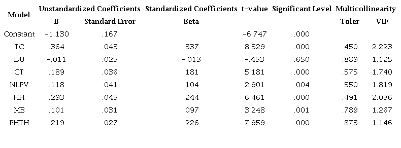 Results of the regression coefficients for each component in the model showed that: DU factor was not statistically significant, ie, no effect on satisfaction with Sig value> 0.05 (0.650). The model is statistically significant with Sig value. The TC, CT, NLPV, HH, MB, PHTH were very small (Sig <0.05). Normalized regression weight (B) of the regression model is positive (+) in accordance with the original expectations hypothesis. Thus, the hypotheses H1, H3, H4, H5, H6, H7 in the study model are accepted. Results showed that TC was the most important factor influencing the dependent variable (Beta = 0.364), HH was the second most important factor (Beta = 0.293), followed by PHTH (Beta = 0.219), followed by CT (Beta = 0.189), followed by NLPV (Beta = 0.118) and MB with the lowest importance for the dependent variable (Beta = 0.101).
