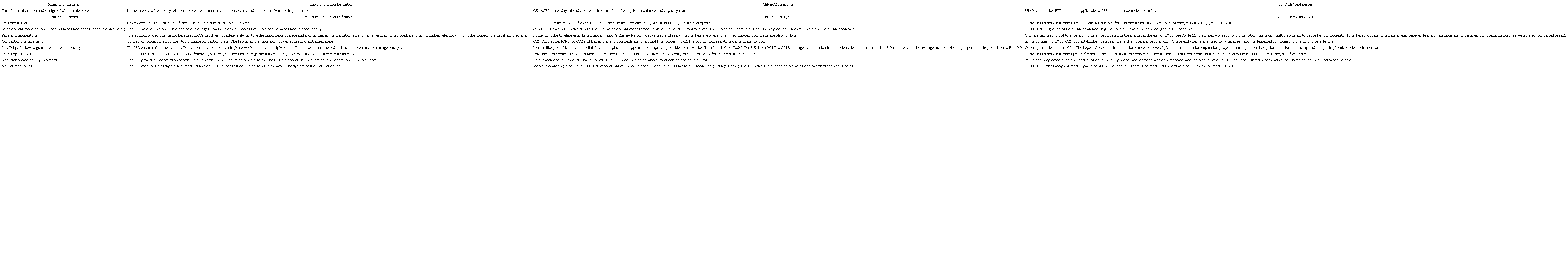 In December 1999, FERC defined the minimum functions of an RTO in Docket No. RM99-2-000, Order No. 2000. FERC based these minimum functions on lessons learned by the regulatory agency since FERC Order No. 888 provided a basis for the first U.S. RTOs in 1996. In Table 2, FERC’s minimum functions are applied in the context of Mexico’s CENACE as a basis for evaluating the system operator’s development to date, as an exercise. These RTO/ ISO minimum functions are listed and defined in the first two columns, and examples of their strengths and weaknesses are evaluated in the following columns.