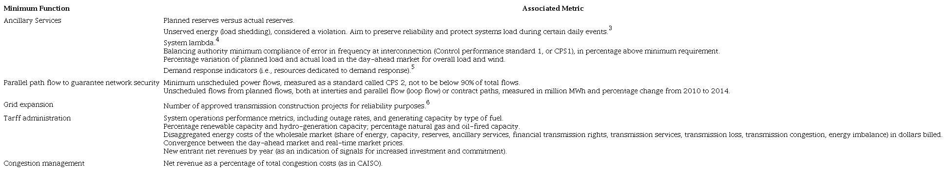 The 2017-2021 strategic plan’s lack of emphasis on promotion of wholesale market products represents a lost opportunity to increase renewable participation in ancillary service wholesale market products. For example, research from 2014 on renewables curtailment under a 50% renewable generation scenario in California found that enabling renewables to provide operating reserve ancillary services reduced curtailment of renewables and had the potential to improve overall market economics during certain times of the year (Nelson and Wisland, 2015). The strategic plan’s noted interest in development of metrics and measurements provides an opportunity for shared learning around co-development of renewables and ancillary service products in the U.S. The following section reviews how FERC and U.S. ISOs developed performance assessment structures and defined metrics in the first ten years of RTO/ISO development. FERC’s “minimum functions” of an RTO/ISO (defined in 1999) are outlined below in the context of CENACE’s first and second years of operation. Following FERC’s minimum functions are 15 more granular metrics and measures of ISO/ RTO performance that have since been developed by FERC.