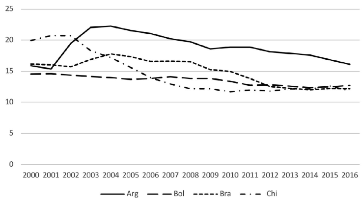 Las Figuras 1 y 2, por otra parte, muestra la evolución de la participación del valor agregado manufacturero en el valor agregado total para el periodo 1989 a 2016 en las economías seleccionadas. Se muestra, en otras palabras, el proceso de desindustrialización que padece la región en esos años. Como puede verse, hay una disminución sostenida de la participación del valor agregado manufacturero. Es importante señalar que esta desindustrialización en este grupo de economías había comenzado a finales de la década los 70s y se profundizó en la década siguiente del siglo pasado. Ahora bien, las recuperaciones que se observan, como en Argentina a principios de la década del 2000 o en Venezuela en 2015, son de corta duración. México, por su parte, muestra una lenta re-industrialización a partir de 2009.