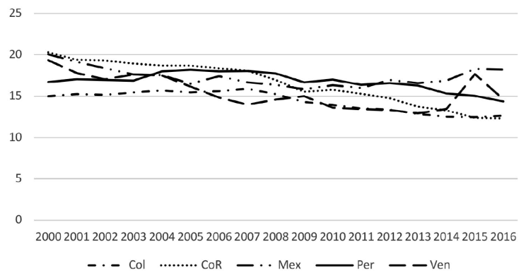El proceso de desindustrialización que se observa puede catalogarse de prematuro toda vez que inició cuando el nivel de ingreso per cápita en términos de dólares constantes de 2011 o en términos de dólares corrientes, según datos de los Indicadores de Desarrollo Mundial del Banco Mundial, era inferior al umbral previamente señalado, esto es entre US$10,000 y US$12,000 (2005=100). Si tomamos como referente el ingreso por cápita en PPP de 2011, la información disponible inicia en 1990, y de ella se desprende que sólo México y Venezuela estaban por encima del umbral. No obstante, como destacamos, el proceso de desindustrialización había comenzado en todas las economías mucho antes. Es claro entonces que para los países de la muestra, el proceso de desindustrialización comenzó antes de lo debido, desprendiéndose que sufren de desindustrialización prematura, medida por el producto manufacturero. Lo mismo puede decirse cuando se mide la desindustrialización a través del empleo. Es decir, se observa (no presentamos los gráficos) una caída constante del empleo en el sector manufacturero como porcentaje del total, también marcadamente desde finales de la década de los 80s. Estos resultados coinciden, en general, con los de trabajos recientes que han demostrado la desindustrialización prematura en países de América Latina (Cruz, 2015, Castillo & Martins, 2016, Harahuchi et al., 2017 y Palma, 2019).
