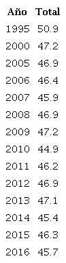 La Tabla 1 reporta el empleo informal de una muestra de 9 economías latinoamericas (Argentina, Bolivia, Brasil, Chile, Colombia, Costa Rica, México, Perú y Venezuela). Estas economías conforman la muestra que se usa en el ejercicio econométrico y su selección se basó en la disponibilidad de información. Como puede verse a lo largo del periodo 1995-2016, los datos sobre el empleo informal en este conjunto de economías se mantienen cercano al del promedio de la región (es decir alrededor del 50%). Es importante descatar, no obstante, que en algunos años se observan disminuciones, con respecto al año anterior, como en 2010, 2014 y 2016. A pesar de estos decrementos, el empleo informal se mantiene en un nivel preocupante, y necesita ser resuelto por todas las implicaciones económicas y sociales que conlleva. Es decir, es un reto mayúsculo en términos de crecimiento y desarrollo económico, así como de pobreza.