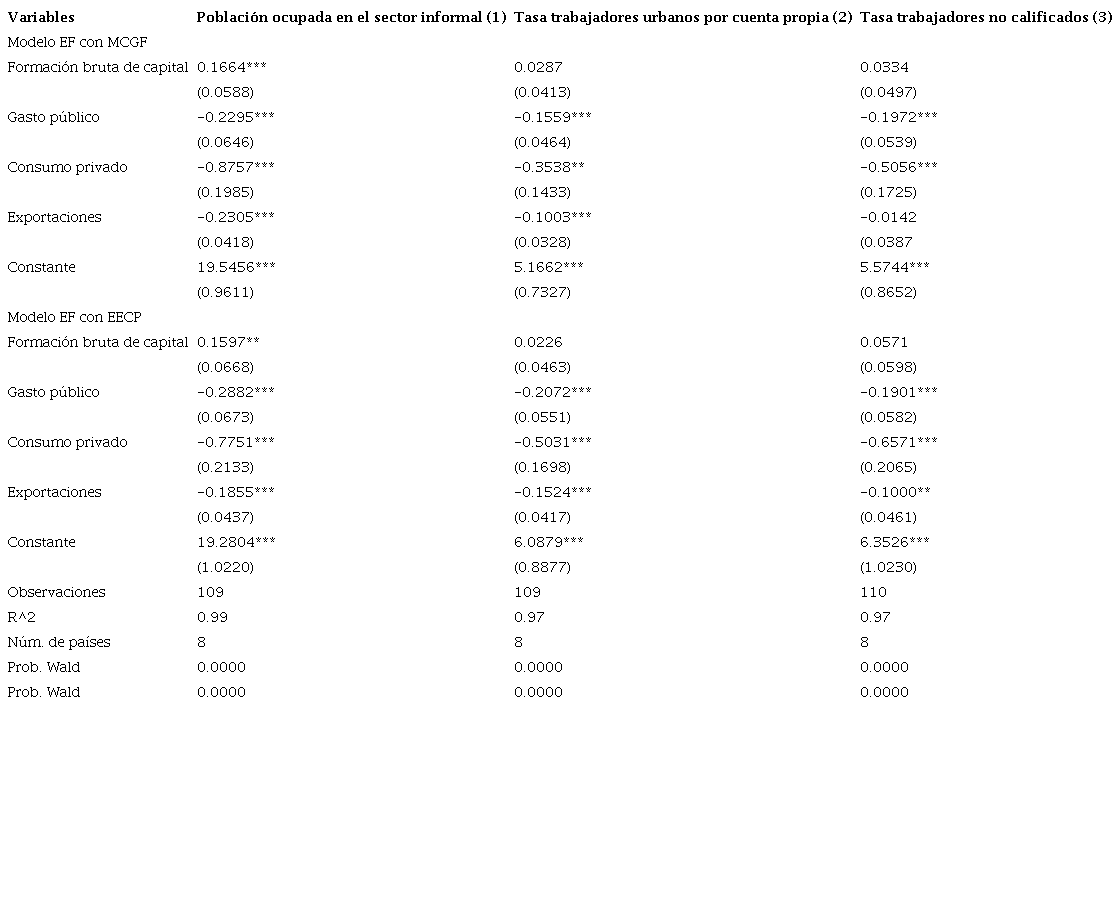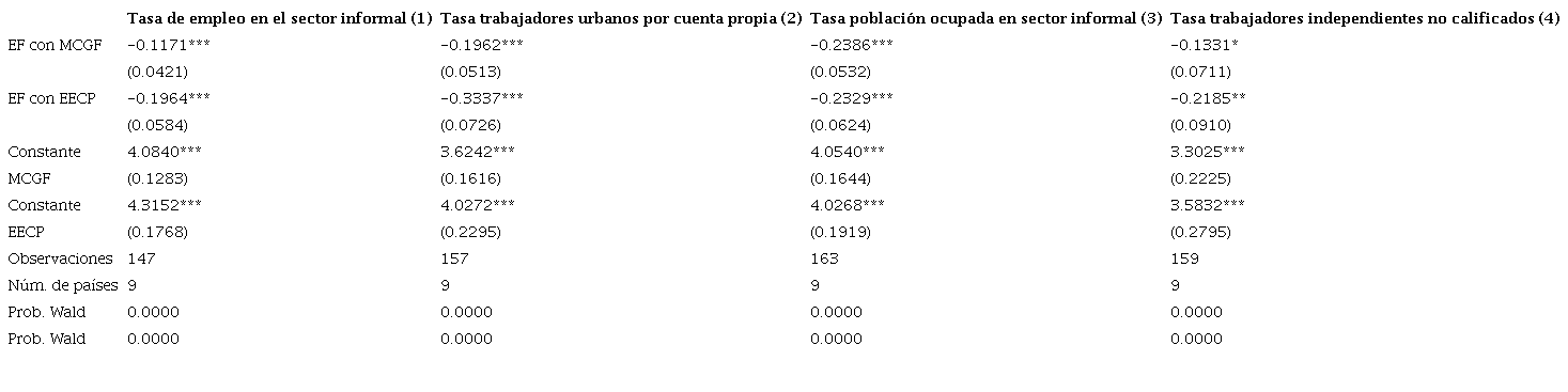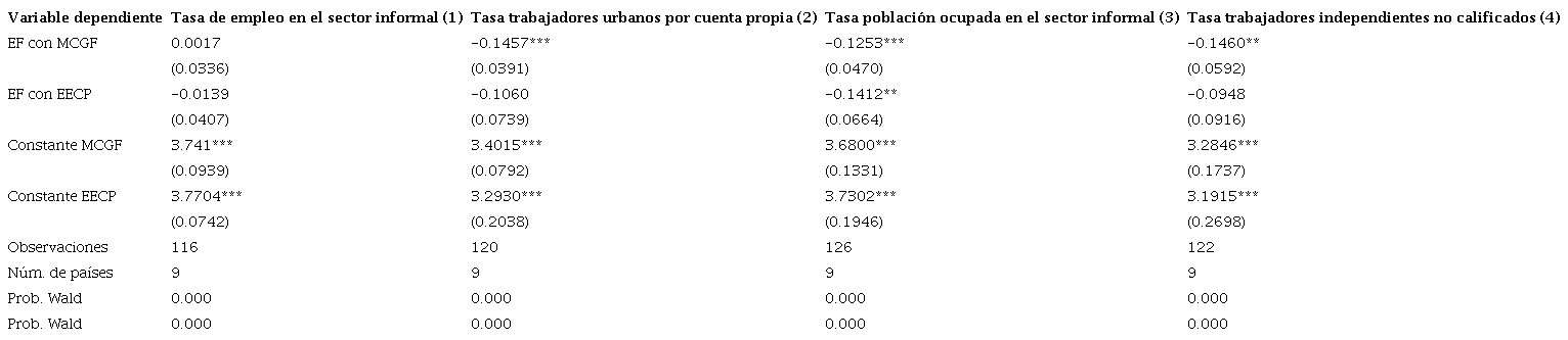 Al respecto, usamos, siempre en tasas, el empleo en el sector informal, los trabajadores urbanos por cuenta propia, la población ocupada en el sector informal y los trabajadores independientes no calificados. Los datos provienen de diferentes bases disponibles en línea. En específico, usamos las bases de datos de la CEPAL, la OIT, y la de los Indicadores del Desarrollo Mundial. Todas las variables fueron transformados en logaritmos con el fin de interpretar los resultados econométricos como elasticidades y realizamos las estimaciones con efectos fijos (EF) para considerar la existencia de heterogeneidad individual de los países seleccionados (Wooldridge, 2010 y Carter et. al., 2011), ajustando los resultados con errores estándar corregidos para panel. También usamos la técnica de Mínimos Cuadrados Generalizados Factibles (MCGF). La intención de usar dos estimadores es probar la robustez de los resultados.