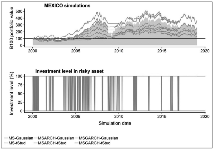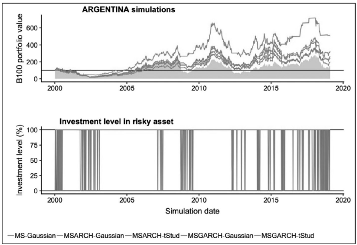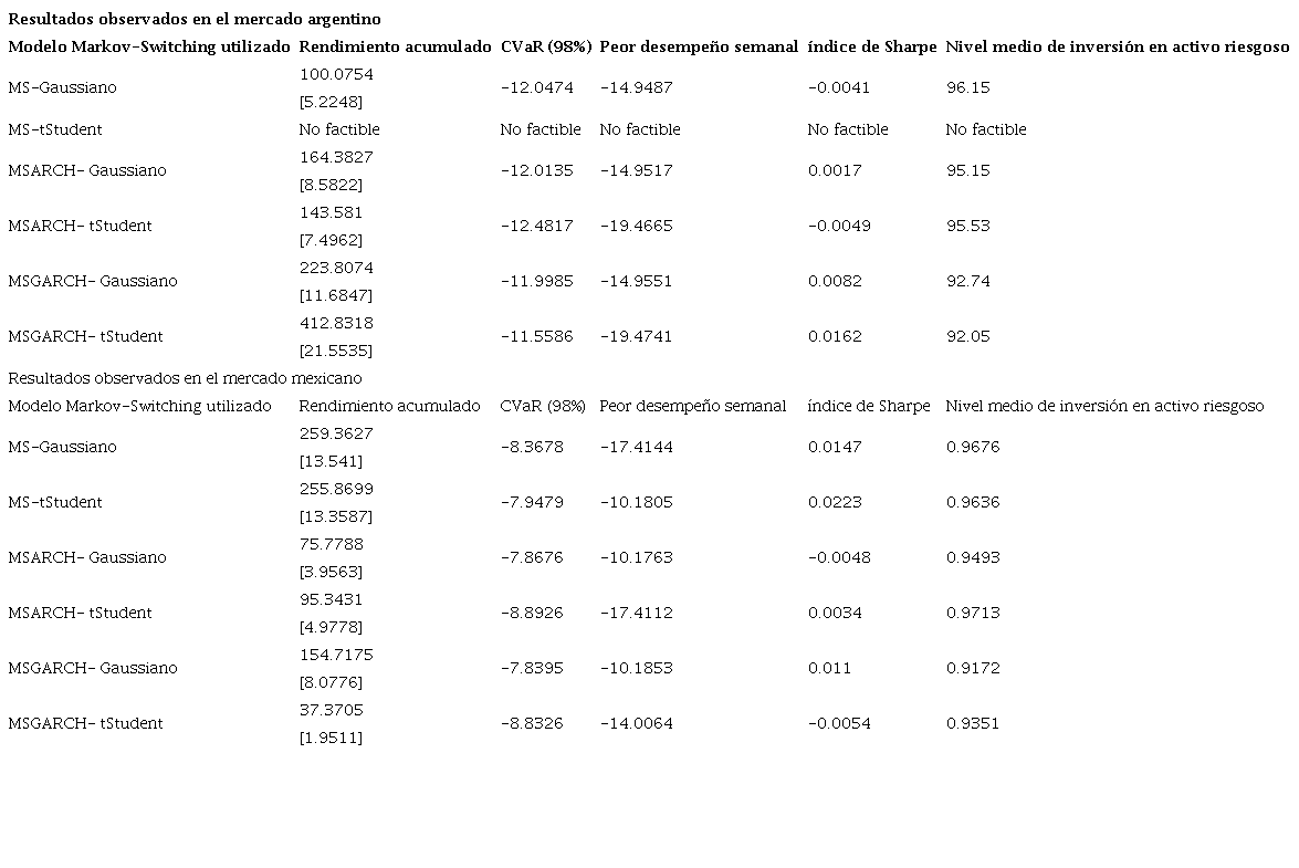 Para comprobar estas dos hipótesis, se realizaron simulaciones semanales de enero del año 2000 hasta enero del año 2019 (996 semanas). Esto, como se mencionó, en los mercados accionarios argentino y mexicano. De manera complementaria, se infirieron recursivamente, en cada fecha, los modelos MS, MS-ARCH o MS-GARCH. Dado esto, se estimaron las probabilidades suavizadas de estar en el régimen de alta volatilidad en t + 1 para realizar la estrategia de inversión previamente descrita. En los resultados de las simulaciones se observó que los modelos MS-GARCH con función de verosimilitud t-Student llevan, para el caso del mercado argentino, a rendimientos acumulados de 412.8318% (21.5535% anual). Esto comparado con un rendimiento acumulado de 56.1372% (2.9308% anual) y de 38.3854% (2.0040% anual) logrados al invertir pasivamente en el índice MSCI argentina y las letras del Tesoro Estadounidense. De manera complementaria, se aprecia que los niveles de exposición al riesgo se reducen gracias a esta administración activa.