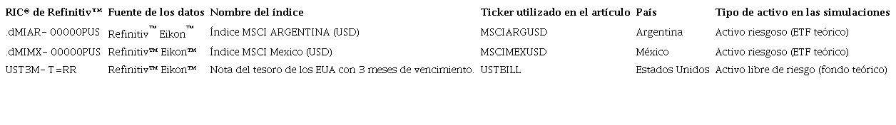 En la Tabla 1 se presenta el resumen de los índices accionarios utilizados como datos de entrada, así como los ticker (o identificadores empelados en el presente artículo) y la definición del tipo de activo que fueron en las simulaciones.