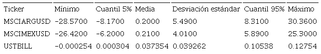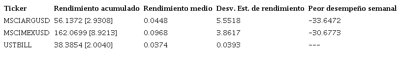 Para el periodo observado y dada la presencia de una crisis financiera y fiscal en Argentina en la parte inicial del periodo de estudio, se aprecia que el MSCI Argentina, tuvo un rendimiento acumulado y medio superior a los USTBILL, pero de prácticamente un tercio del rendimiento acumulado o casi la mitad del rendimiento medio logrado en el caso mexicano.
