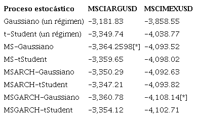 Como se puede apreciar, resulta más apropiado utilizar un proceso estocástico de dos regímenes para modelar el comportamiento de la serie de tiempo de rendimientos (rt ) de los índices. De manera más precisa, dentro de los 6 procesos estocásticos estudiados en este trabajo, el modelo MS gaussiano con varianza constante se aprecia como el mejor para modelar el comportamiento del índice MSCI argentino y el MS-GARCH gaussiano el del mexicano.