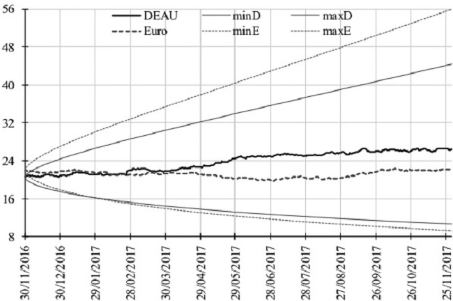 La actualización de los parámetros α-estables es fundamental para obtener estimaciones adecuadas de los riesgos financieros involucrados. En la Figura 1 se muestra un intervalo al 99% de nivel de confianza con parámetros α-estables fijos para la paridad de los tipos de cambio dólar estadounidense y del Euro para el periodo del 30 de noviembre de 2016 al 25 de diciembre de 2017, considerando los parámetros α-estables estimados con los rendimientos del periodo del 2 de enero de 2014 al 30 de noviembre de 2016 utilizando los datos de las Tablas 1, Tabla 2 y Tabla 3: