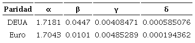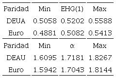 La Tabla 3 muestra la estimación de los parámetros α-estables para las paridades de los tipos de cambio del dólar estadounidense y euro a través del método de verosimilitud máxima.