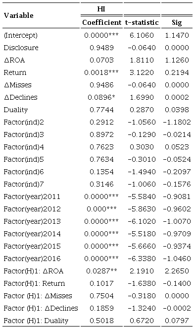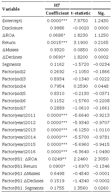 Table 10 indicates our last test results where we include subsidiaries (Segments) as the moderator variable. In contrast to what we expected, we find that the coefficient on (Factor (H)1: Segments) is 0.1755, and disclosure quality has no significant relationship with compensation in firms which have complex activities and control a few subsidiaries, meaning that when the bonuses are going to be paid, Iranian complex firms which have a few number of segments do not consider the quality of financial information reported by the managers.