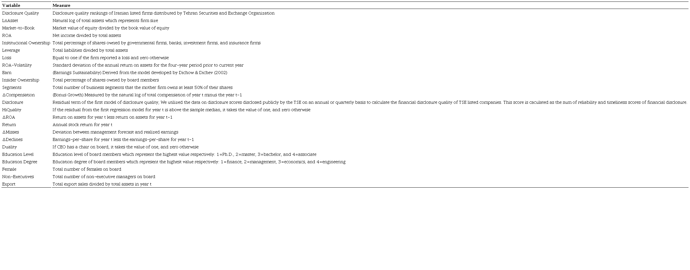 In order to make proper investment decisions, the users of financial information need accurate and timely data (Behrouzi et al., 2013). When firms report information which lacks transparency, they encounter credit risk and lose shareholders’ faith. This situation substantially lessens the liquidity and reliability in the capital market. Indeed, the main reason behind capital markets’ boom in long term is the environment in which divulged information is transparent (Madhani, 2009). Appropriate disclosure and information transparency have more positive impacts including information asymmetry reduction (Petersen & Plenborg, 2006; Barth et al., 2013), stock liquidity increase (Bloomfield & Wilks, 2000; Goh et al., 2008), firm values enhancement (Hassan et al., 2009), and earnings management reduction. Disclosure on dictionary means unfolding the information. By means of Kohler’s dictionary, a clear show of a fact or condition on financial statements, explanatory notes, and audit reports is considered as disclosure. Market participants are always seeking high quality information because of their capabilities in reducing the information asymmetry between managers and investors. Several studies in the accounting literature illustrate that higher disclosure quality alleviates the information asymmetry. According to the findings of Francis et al. (2005), extensive disclosure policy is a mechanism for diminishing information asymmetry. Glosten & Milgram (1985) argue that the higher disclosure quality results in the lower information asymmetry. Welker (1995) declare that in proportion to the disclosure level, information asymmetry and market liquidity go lower and higher respectively. Lang & Lundholm (1996) contend that firms pursuing informative disclosure strategies are more followed by consistent analysts, have less variances in analysts’ forecasts, and have more accurate profit forecasts. Also, according to the findings of Kim et al. (2008), there is a negative relationship between information asymmetry and disclosure quality andan increase in disclosure transparency can aid investors to evaluate earnings management.