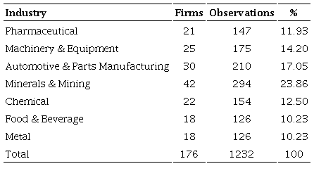 We obtain our required data manually from the hardcopy financial statements held in the TSE library (i.e. Codal1 and its supplementary software known as Rahavard Novin) for the sample 2010 to 2016. We then exclude firms with non-calendar fiscal year end, firms with missing or insufficient variable data and firms with fiscal year change during 2010-2016. We also exclude firms operating in banking industry as well as financial and investment institutions to measure the variables used in our equations, primarily because financial institutions and banking industry have different reporting requirements that could influence the figures associated with dependent variables. This leaves us with a primary sample of 1232 firm-year observations (see Table 2). The distribution of sample among industries is displayed in Table 2, indicating that the at top of the table are minerals & mining and the automotive & parts manufacturing industries with 23.86% and 17.05% of the whole sample observations, followed by the machinery & equipment, chemical, pharmaceutical, food & beverage, and metal industries with 14.2%, 12.5%, 11.93%, 10.23% and 10.23% of the sample observations respectively.