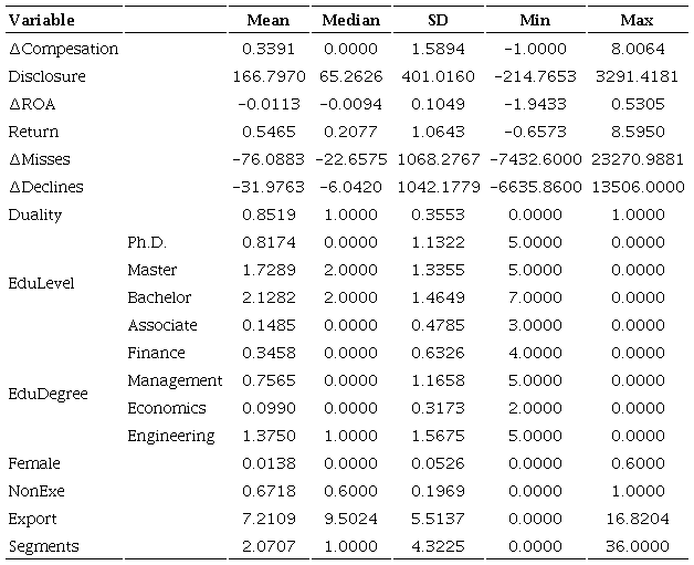 In model (2), ΔCompensation (board compensation) is our variable of interest and used as the dependent variable. Disclosure quality of financial information is our independent variable which is derived from the model (1). Regarding the moderator variables, we use a series of corporate governance variables including board members’ education level (EduLevel); board members’ education degree (EduDegree); if CEO has a position on Board (Duality); females on board (Female); independent directors on board (NonExe); foreign sales (Exports); and the number of subsidiaries (Segments). The information shown in Table (1) is a succinct description of variables used in our models.