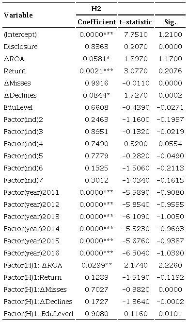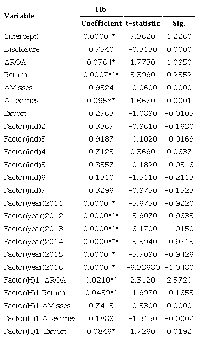 Table 9 demonstrates our sixth test results where we include foreign sales (Export) as the moderator variable. Unlike what we anticipated, we find that at 5% margin of error, the coefficient on (Factor (H)1: Export) is 0.0846, and compensation has no significant relationship with disclosure quality in firms which have complex activities and export their products. But at 10% margin of error, the variable is positive and significant, meaning that when the bonuses are going to be paid, Iranian complex firms which have a number of exported goods on their financial statements consider the quality of financial information reported by the directors.