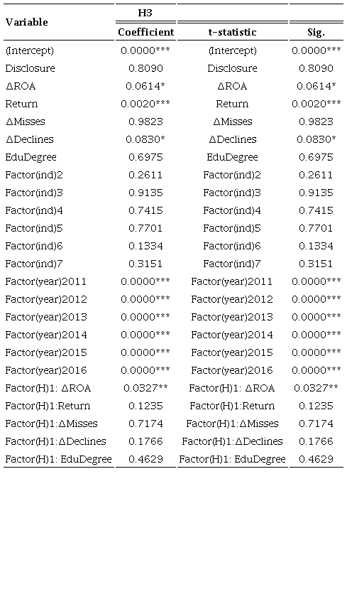 Table 6 represents our third test results where we include education degree (EduDegree) as the moderator variable. Contrary to our primary expectations, we find that the coefficient on (Factor (H)1: EduDegree) is 0.4629, and disclosure quality has no significant relationship with compensation in firms with members of high education degree, meaning that the participation of these experts in boards is unlikely to have a significant impact on the mentioned relationship.