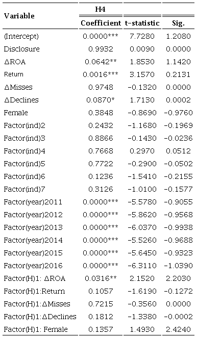 Table 7 presents our fourth test results where we include the presence of females on board (Female) as the moderator variable. In contrast to what we primarily expected, we find that the coefficient on (Factor (H)1: Female) is 0.1357, and disclosure quality has no significant relationship with compensation in firms which employed female members on board, meaning that when the bonuses are going to be paid, Iranian firms which have female members on board do not consider the quality of financial information reported by the directors.