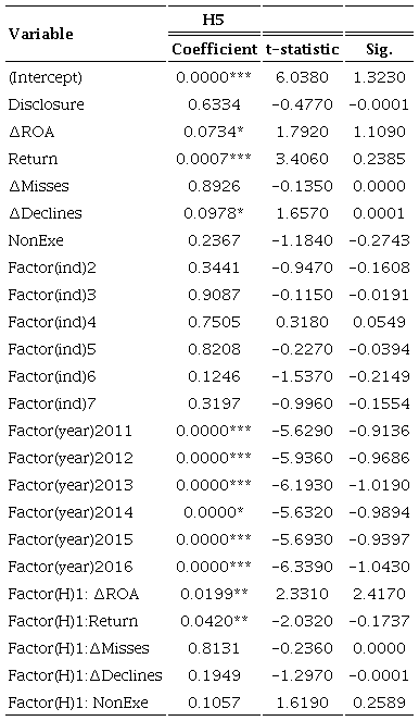 Table 8 indicates our fifth test results where we include the presence of independent directors on board (NonExe) as the moderator variable. Unlike what we expected, we find that the coefficient on (Factor(H)1: NonExe) is 0.1057, and compensation has no significant relationship with disclosure quality in firms which have independent members on board, meaning that when the bonuses are going to be paid, Iranian firms which have non-executives do not consider the quality of financial information reported by the managers.