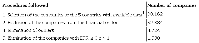 From the universe of the 10 countries which obey the rule presented, those in which the nominal tax rate didn't suffer changes between 2012 and 2014 were excluded. The reason for this was to check the effects a change in the nominal rate has in the effective tax rate. Thus, Ireland, Italy, Netherlands, Poland and Portugal were excluded. On Table 2 we can observe the steps for the sample selection. The choice of the period of time (2012 to 2014) was defined in a way that the most updated data of the companies available may be studied and during a period of time which minimises bias in the results. Since the financial sector has different characteristics from the rest, and companies from this sector aren't being analysed in this research, all companies from this sector have been excluded from the sample. According to the methodology of Adhikari et al. (2006) and Gupta and Newberry (1997), companies with lower ETR's or equal to zero and over one have also been eliminated, because not only negative ETR's but also the ones over 1 represent unusual cases which can cause bias to the results. Finally, when excluding outliers all companies which in each variable were outside the range of the average plus/minus twice the standard deviation were selected. We then reached a sample of 1530 companies from 5 countries: Denmark, Finland, Luxembourg, Slovenia and the United Kingdom.