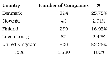 On Table 3 we can observe that the least represented country in the sample is Luxembourg, with only 37 selected companies out of the 1530 total companies of the sample, which corresponds to 2.42% of the sample. On the other hand, the best represented country is the United Kingdom with 800 companies, which represents 52. 29% of the sample. Denmark is the second best represented country, with 25. 75% of the sample and 394 companies.