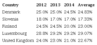 Out of the countries of the sample, Slovenia is the country with the lowest nominal rate throughout the 3 years with an average rate of 17.33% during the analysed period of time, as opposing to Luxembourg which represents the highest rate of all 5 countries, with an average of 29.07% which can be seen on Table 4. The presented nominal rates represent the maximum rate from each country (including surcharges).