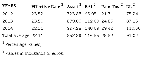 On Table 5, we can analyse the evolution of the effective tax rate, the total asset, the results before tax (RAI), the paid tax and the sample's companies' net profit (RL). It is proven that, in general, the presented variables registered a growth with an exception of the effective rate, which presents a decrease throughout the 3 years.