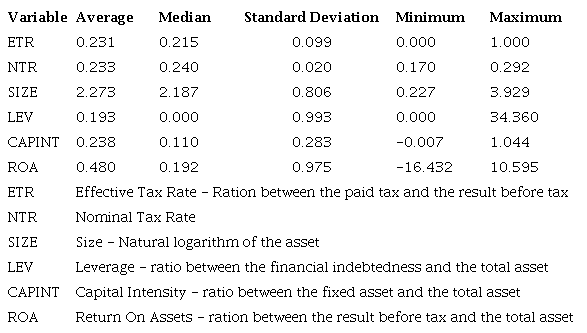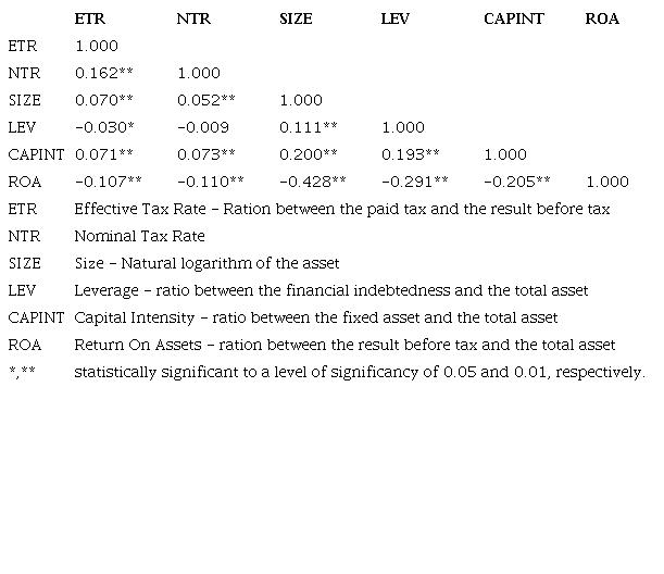 On Table 6, there is the descriptive statistics of each of the variables included in the model, the average, the median, the standard deviation, minimum and maximum. The dependent variable (ETR) presents an average of 23.1%, whilst in the nominal rate variable we can see that the lowest value is 17% and the maximums 29.2%, which corresponds to an average of 23.3%. It is also visible that the average of the ETR, LEV and ROA variables are higher than the average of the sample variables of Adhikari et al. (2006).