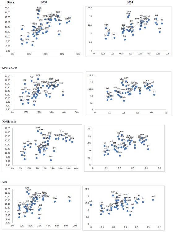 Os resultados foram gerados a partir da agregação dos países em três grupos distintos: Renda baixa, até US$ 20.000,00 per capita (paridade poder de compra, a preços constantes de 2011); Renda média, entre US$ 20.000,00 e US$ 35.000,00 per capita; e, Renda elevada, acima de US$ 35.000,00 per capita. Os dados de renda utilizados na classificação foram obtidos para o ano de 2014, sendo extraídos da base de dados do Banco Mundial (2020). O agrupamento dos países de acordo com esses níveis de renda é explicado pelas características apresentadas pela amostra, a qual é composta principalmente por países com nível de renda mais elevado. De modo que a definição dos países e do período de realização da análise é restringida pela disponibilidade dos dados.
