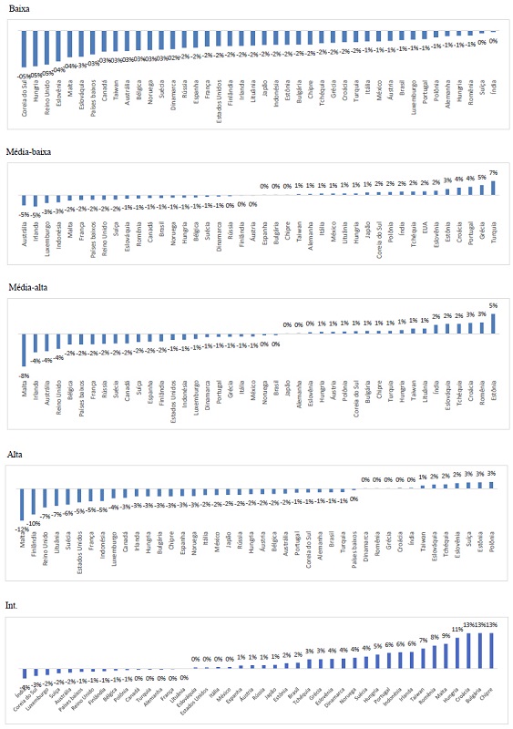 Quanto à variação da participação nas horas trabalhadas (Tabela 5), os países com renda elevada registram recuo nos ramos de Baixa e Média-baixa intensidade tecnológica e de Serviços finais para todos os subsistemas.