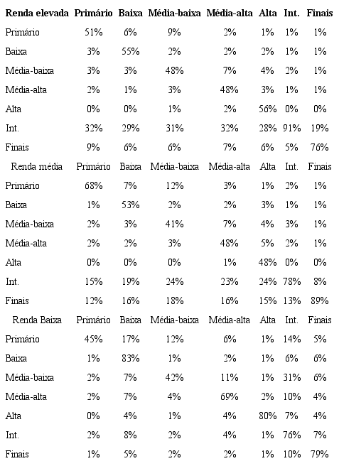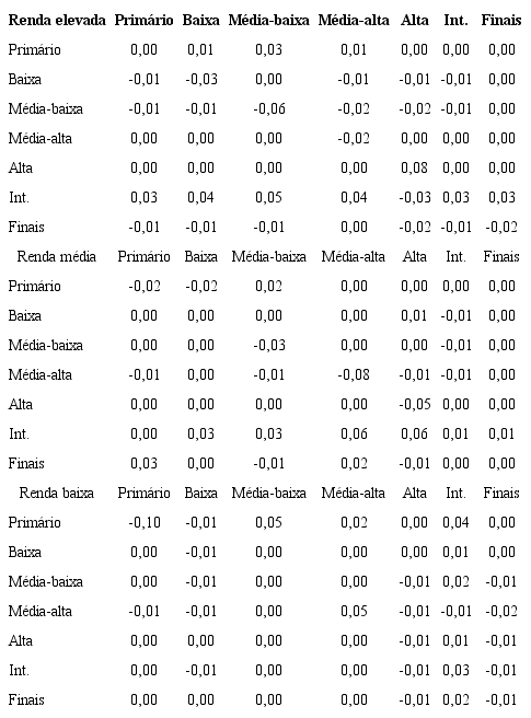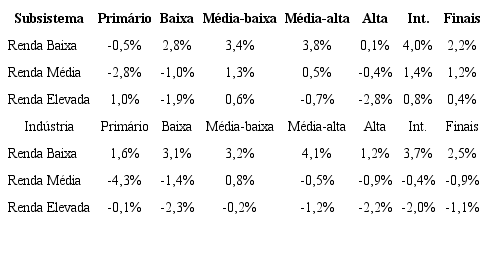 A Tabela 4 compara as participações nas horas trabalhadas encontradas para os países com renda per capita baixa, menos de US$ 20.000,00; Média, entre US$ 20.000,00 e US$ 35.000,00, e Elevada, acima de US$ 35.000,00. Os países com renda mais elevada apresentam maior participação das horas trabalhadas no ramo de serviços intermediários (Int.) em cada subsistema industrial. Esse ramo responde por 29% dos empregos gerados no subsistema de Baixa intensidade tecnológica; 31%, no subsistema de média-baixa; 32%, média-alta e 28%, Alta intensidade tecnológica. Os países com renda per capita média, por sua vez, registram participação de 19% no subsistema de Baixa intensidade tecnológica; 24%, Média-baixa; 23%, Média-alta e 24% Alta. Já os países com renda baixa registram participação de 8% para o subsistema de Baixa intensidade tecnológica; 2%, Média-baixa; 4%, Média-alta; e 1%, Alta.